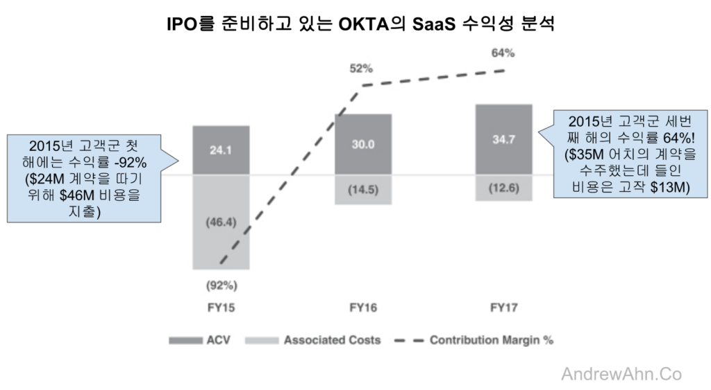 SaaS 회사의 매력은 고객과의 관계가 오래될수록 수익성이 증가 된다는 것이다. On-premise 의 경우는 아무리 오래된 관계의 고객이라도 새로운 시스템을 설치하게 되면 엄청난 비용이 들기 때문에 그 관계에서 추가적으로 이득을 보는 것이 없다. 반면 SaaS는 고객에게 투자해야 하는 비용은 점점 줄어들고 (예를 들어 초반에는 Customer Success 인력을 많이 투입시켜 고객의 문의 사항 및 불편함을 해소하지만, 그 후에는 모두가 사용법을 숙지하고 있기 때문에 신경써서 지원해야 하는 경우가 줄어듬) 동시에 expand 전략을 통한 매출 증대가 이루어지기 때문에 눈에 띄게 이익폭이 늘어나게 된다. 말 그대로 ‘농사 잘 지은’ 느낌 확실히 받을 수 있는 것이다. 매 해 지날수록 사업 지표가 좋아지는 SaaS 모델을 도입한 회사들이 요새 IPO의 대부분을 차지하는 것은 우연이 아니라고 생각한다.